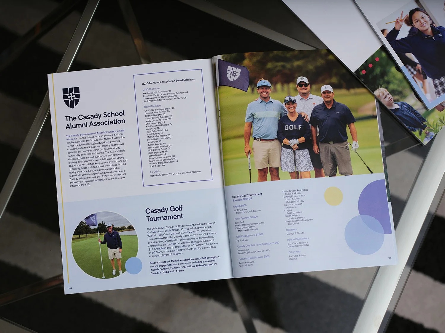 Magazine design for Casady School, showcasing the 2025–2026 school year and the 2024–2025 annual philanthropy report.